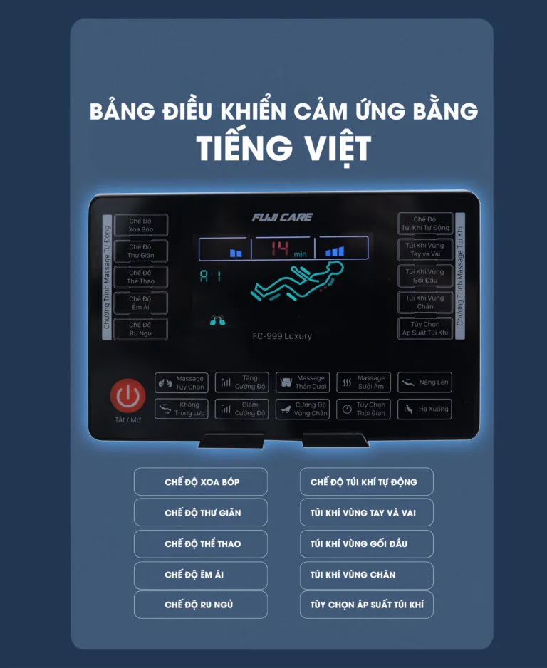Sự thân thiện của FC – 999 với người dùng được thể hiện ở thiết kế bảng điều khiển cảm ứng, ngôn ngữ tiếng Việt. Đây là điểm vượt trội hơn hẳn so với các sản phẩm cùng phân khúc giá. Quý khách sẽ dễ dàng sử dụng ghế massage để tận hưởng hệ thống bài tập đa dạng.
