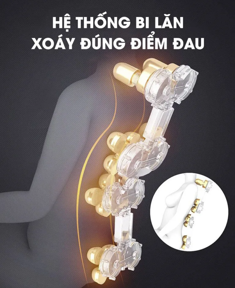 Trang bị bi lăn tại 3 vùng trọng yếu: đầu, lưng và hông. Đặc biệt con lăn vùng đầu tác động vào huyệt phong trì giúp giảm chóng mặt, kém tập trung và tăng cường trí nhớ cho người lớn tuổi.