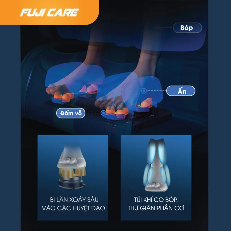 Tập trung vào các huyệt đạo hành gian, thái khê, giải khê từ vùng gối đến bàn chân. Sự kết hợp giữa túi khí co bóp bắp chân và bi lăn ấn sâu huyệt đạo lòng bàn chân giúp đôi chân hồi phục nhanh chóng.