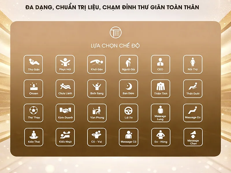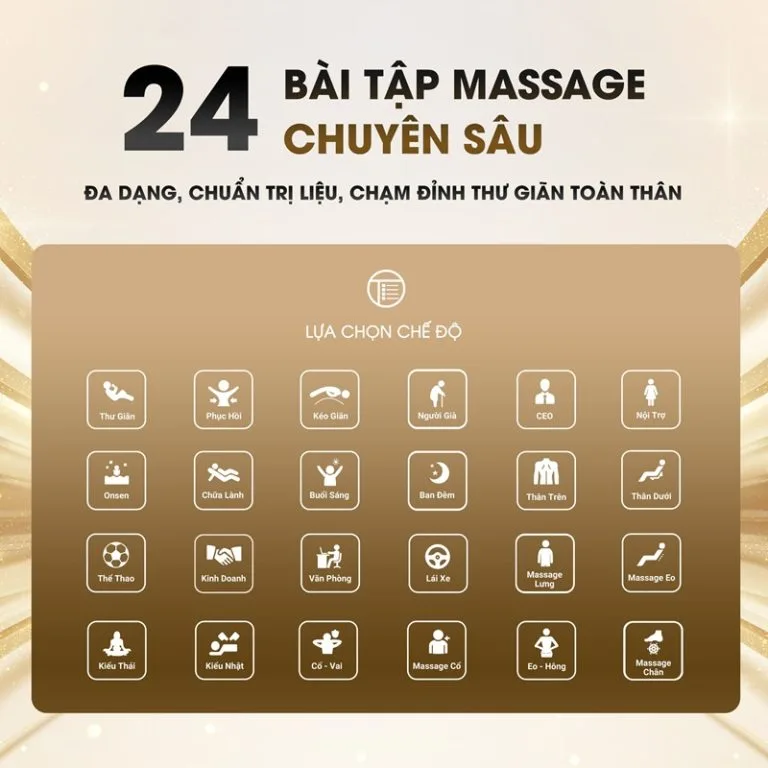 Ghế massage hiện đại không còn chỉ dừng lại ở vài chế độ cơ bản. Nổi bật trong đó là hệ thống 24 bài tập massage chuyên sâu của Fujiwaga, được thiết kế đa dạng, chuẩn trị liệu và cá nhân hóa theo từng nhu cầu sử dụng. Dưới đây là phân tích chi tiết các bài tập trên dòng siêu phẩm Medsonic 29.80 mới nhất.